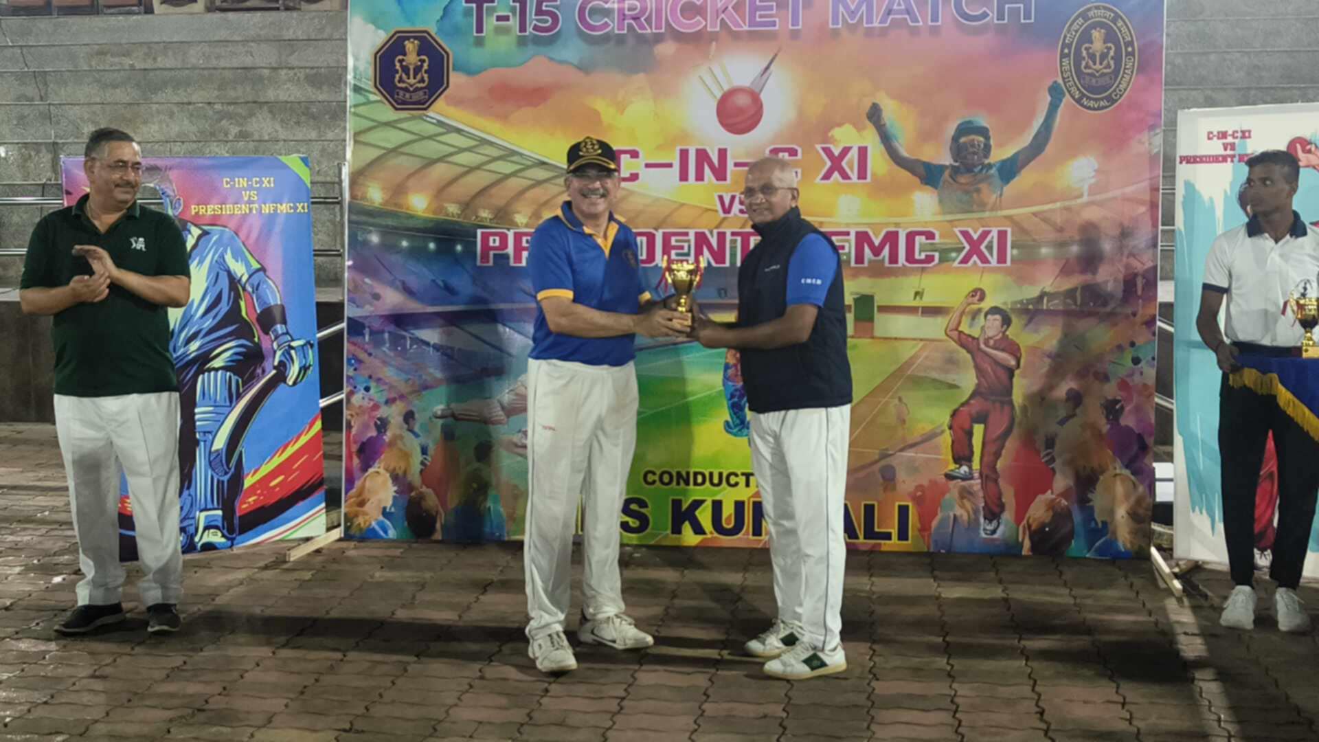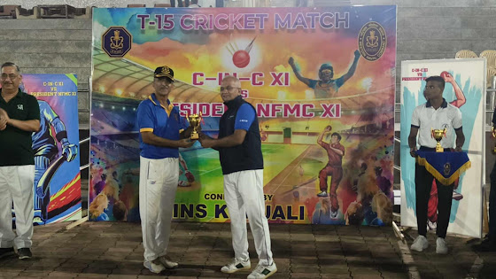 Veterans XI had only 3 practice sessions on 14 , 21 and 28 Dec at NCS grounds. CinC team also had a few practices for their team at the Kohli stadium prior to the D/N T-15 final match on 5 Jan 2025. Admin Orders were issued by CAPO for coordination and conduct of the match, detailing Kunjali for organising the event, under the overall Coordination by CSPTO. A rolling trophy had been instituted by NFMC which was taken home by the Veterans in 2020 and clinched and retained by CinC XI in 2022, 2023 and 2024. The Kohli stadium ground was prepared and well decked up. There were two separate enclosures for players and enough chairs in the stands for spectators. It was planned to commence the match at 6’ O clock to finish it in time for Drinks and Dinner at IMSC for the teams and all spectators. Both the teams, the young Veterans XI and the younger C-in-C XI were evenly poised to lift the Rolling Trophy. Veterans were eager to reclinch it after conceding it last 3 yrs.
